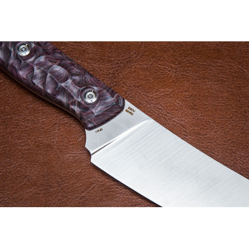Кухонный нож S12 S90V из порошковой нержавеющей стали S90V с твердостью 62 HRC КРИО. Поверхность клинка - сатин. Материал рукояти - микарта. Длина клинка 134 мм, ширина 37 мм, толщина 2,5 мм. Вес - 135 грамм. Комплектация: ножны и сертификат в комплектацию не входят. Более подробная информация во вкладке Характеристики. ВНИМАНИЕ!!! Рукоять ножа неразборная. Плашки и винты залиты эпоксидной смолой для герметичности.