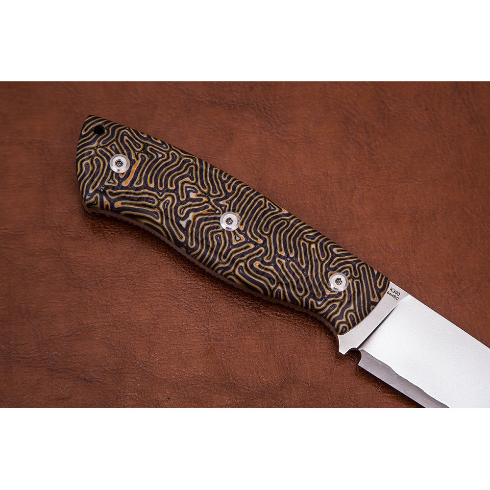 Нож К390 СН 11-11 ламинат из порошковой быстрорежущей стали BOHLER K390 с твердостью 64 HRC, центральный слой - BOHLER K390, обкладки - нержавеющая сталь 95Х18. Поверхность клинка - заполированный пескоструй + травление. Материал рукояти - микарта. Длина клинка 116 мм, ширина 32 мм, толщина 3,5 мм. Вес - 165 грамм. Нож комплектуется ножнами из кайдекса. Более подробная информация во вкладке Характеристики.