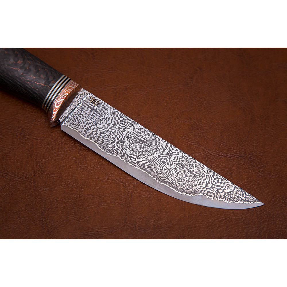 Подарочный нож №2 PMD60 ламинат, центральный слой: порошковая быстрорежущая сталь PMD60 с твердостью 67 HRC, на обкладках - нержавеющий торцевой дамаск . Поверхность клинка - полировка + травление. Материал рукояти - карбон + гарда мокумэ. Длина клинка 140 мм, ширина 30 мм, толщина клинка 3.7 мм. Вес - 198 грамм. Комплектация: нож, ножны из кожи растительного дубления, сертификат, подарочная коробка. Более подробная информация во вкладке Характеристики.
